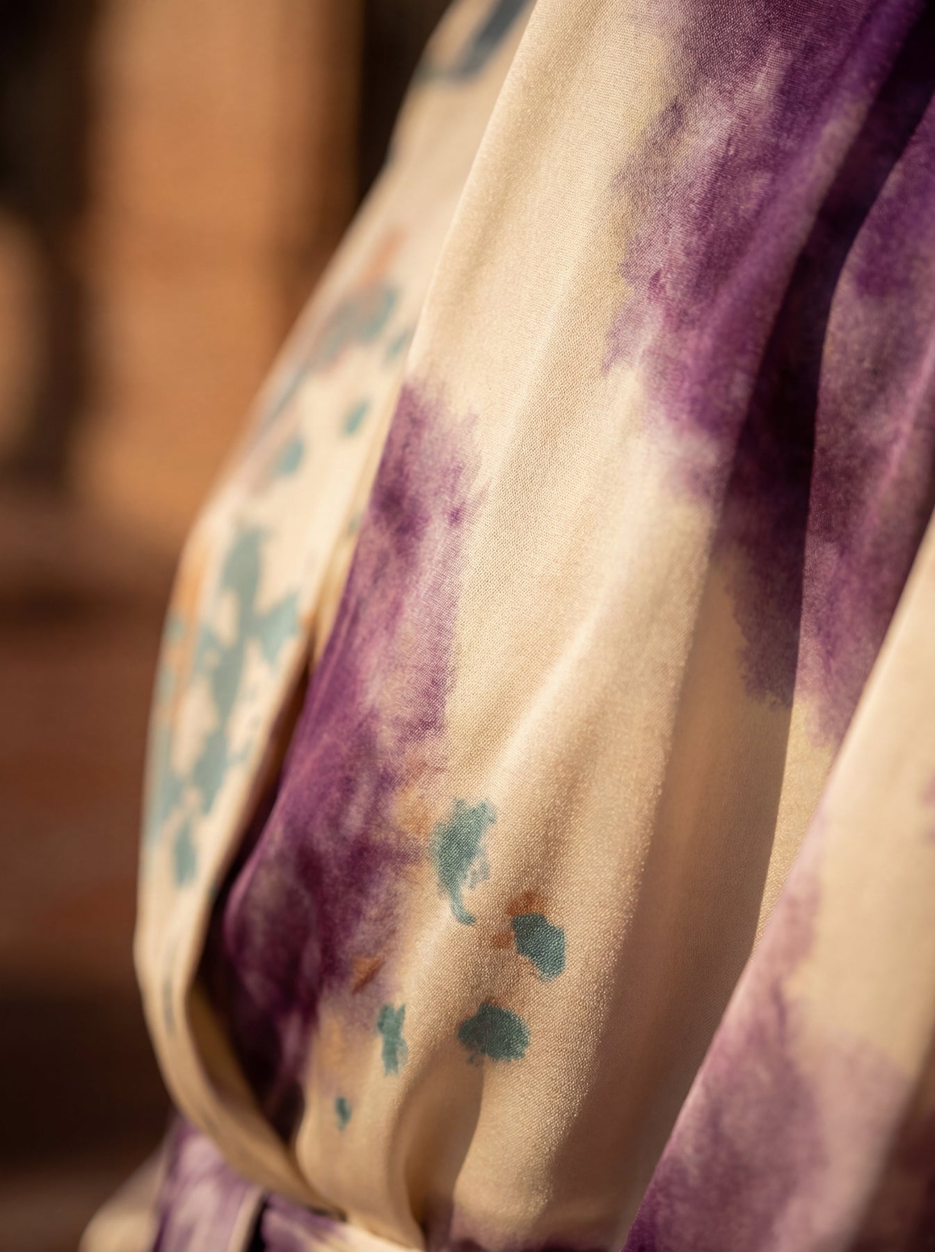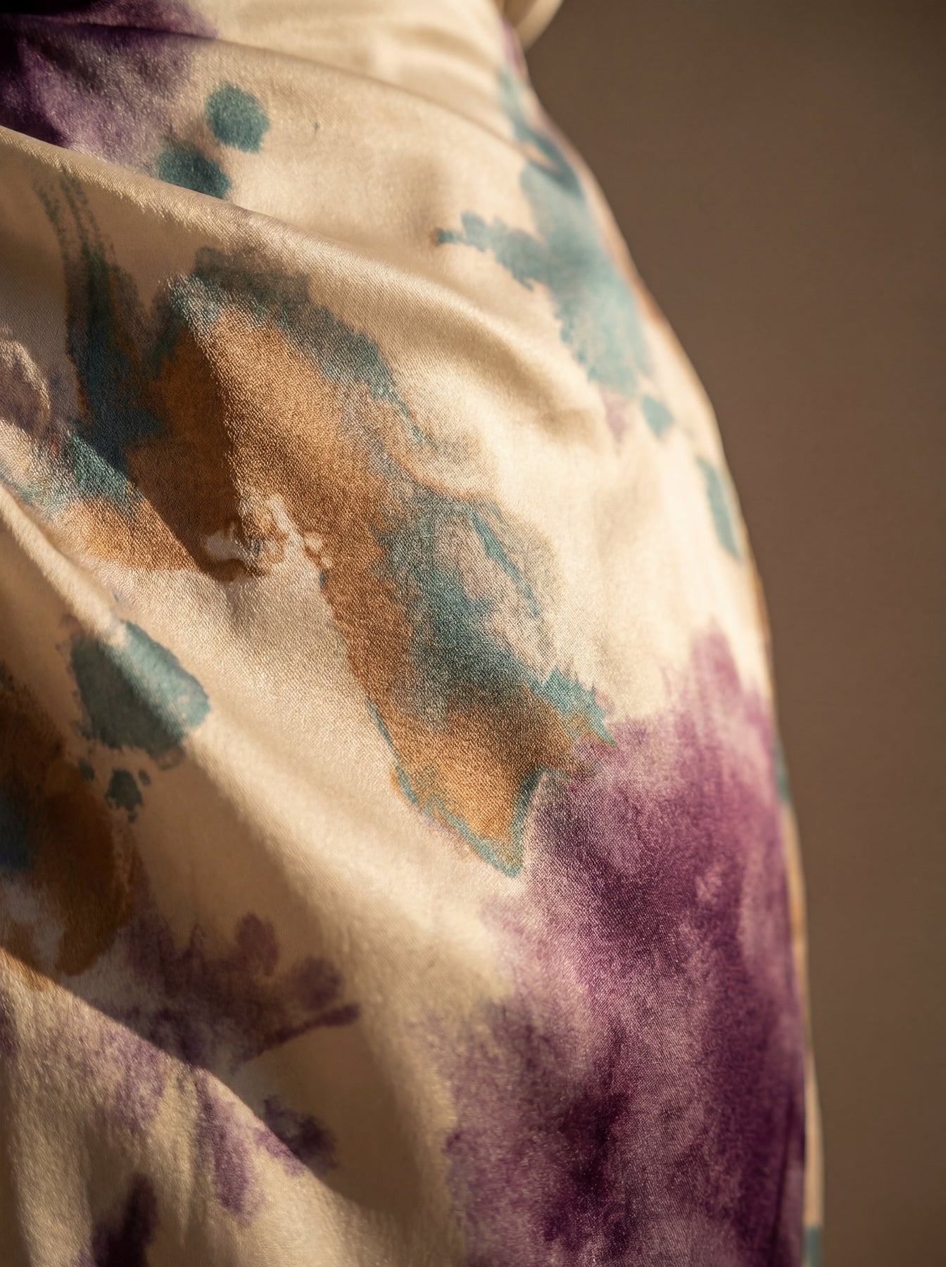 A dress that speaks for itself. The cream satin base is transformed by a watercolour print in shades of mauve, teal and caramel — like a painting that moves with you. The crossover V-neckline elongates the figure, whilst the balloon sleeves with elasticated cuffs add that touch of drama that makes it unforgettable. The knot at the waist effortlessly defines the silhouette.